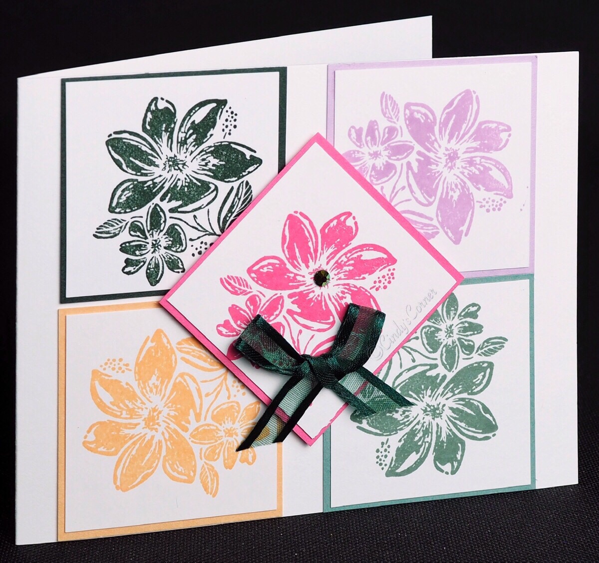 I am really rather taken with this years choices and created today’s card to show all 5 colors, with a little of the ribbon and the in-color jewels, along with the Elegantly Said Stamp Set. I did not use a greeting – let the colors and images do all the work.