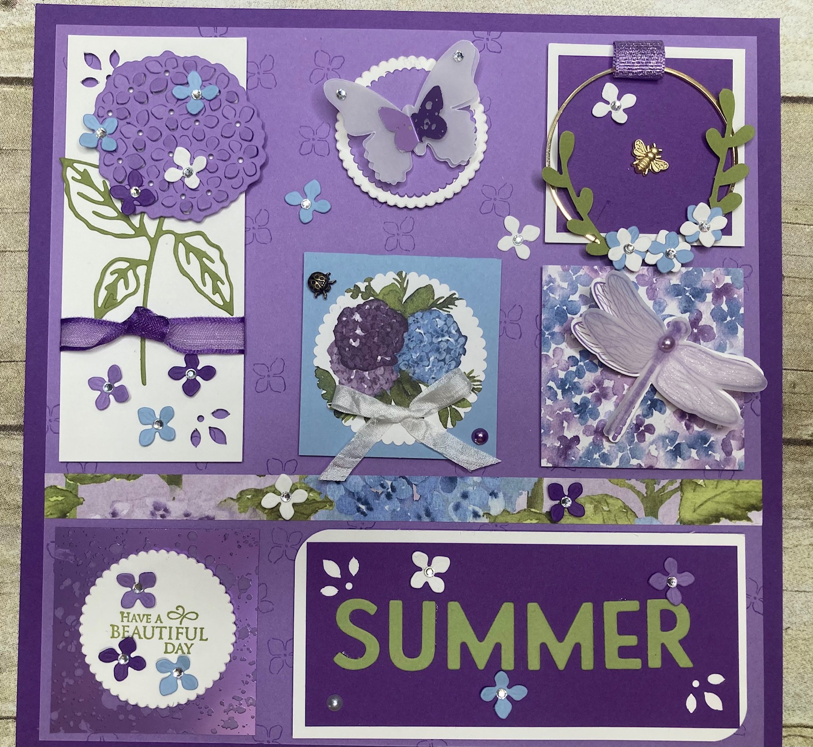 I had a request from my ladies for seasonal 8 x 8 samplers they could display, so we started with summer and will continue with the Fall themed one in August. The starting point for me is the beautiful Hydrangea Hill DSP – which is still available for a few more days, so please get your order in now to avoid disappointment 🙂