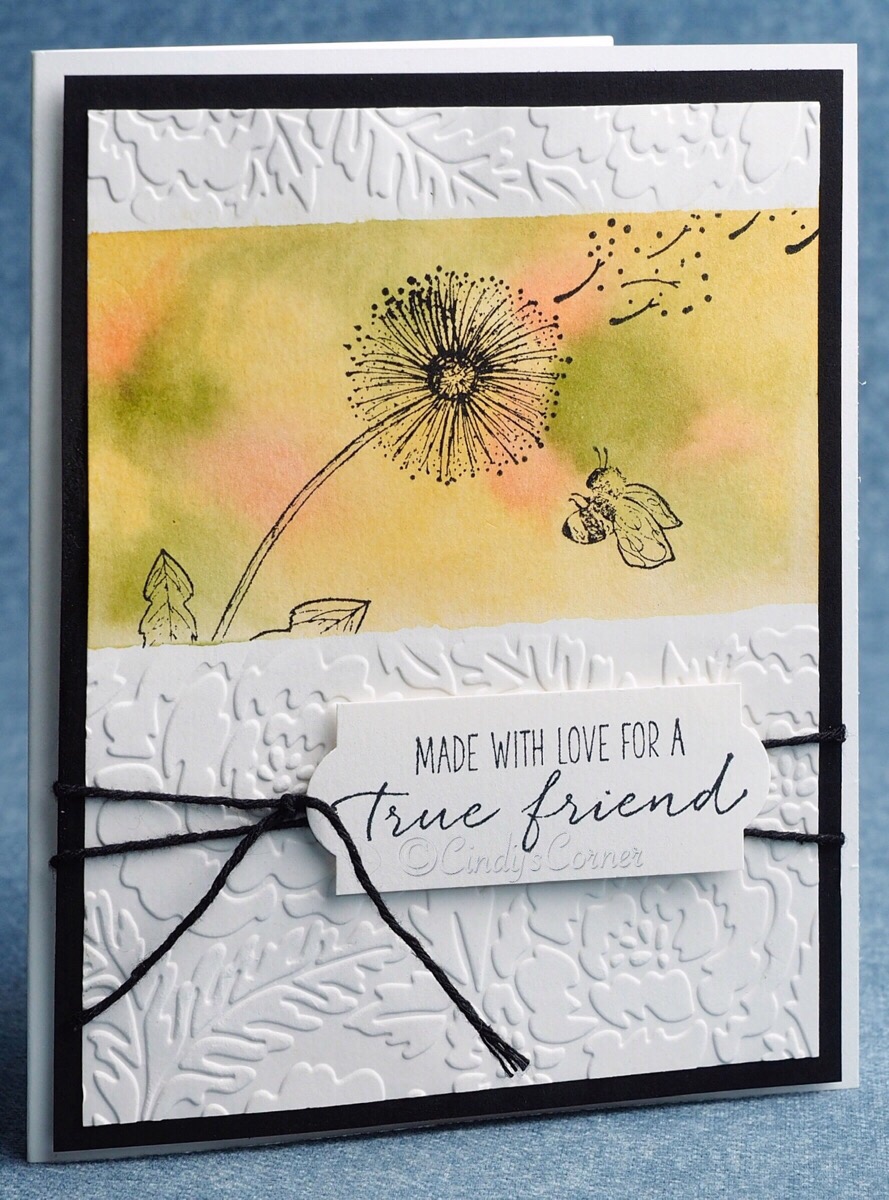 I have a few techniques to share with just one card!! The first one is a faux watercolor technique using different ink colors, partial dry embossing where some parts of the card are embossed and others are not and as a finale – how to use your punch to create an alternate size label! It sounds a lot I know – the good news is there is a video to show how they all come together.