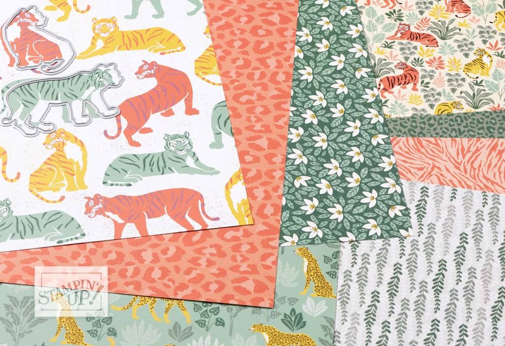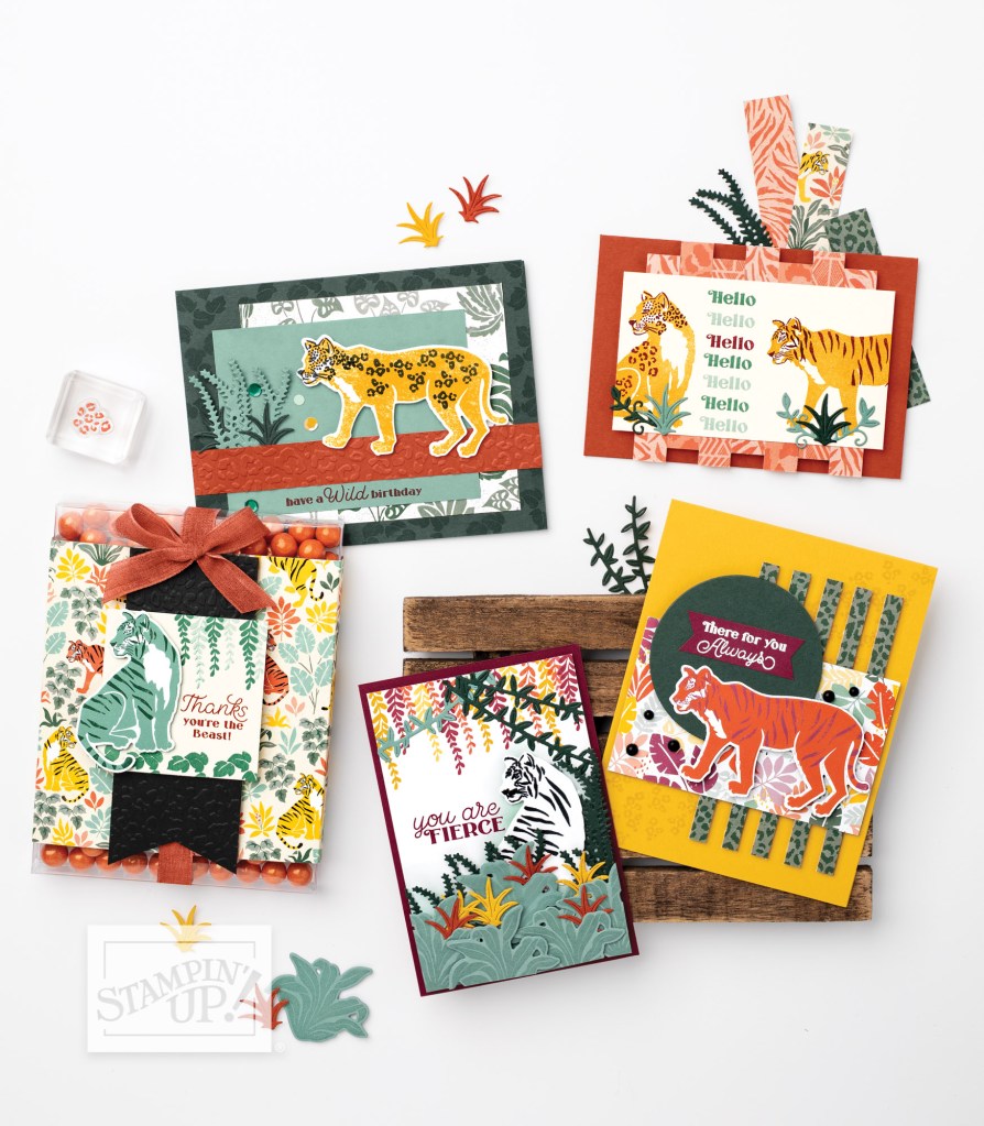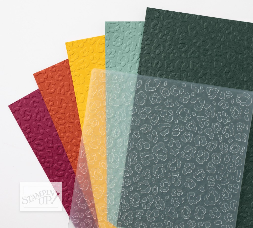 Animal prints are very popular, this year Stampin’ UP! have created the In the Wild Suite which has a stamp set, coordinating Dies, decorative paper and an embossing folder that will allow you to create projects with jungle themes with tigers and leopards.
