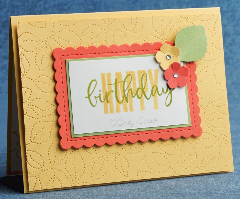 - Layer 1: 51/4 x 4 So Saffron Card, run thru the Cut and Emboss Machine with the Stitched Greenery Embossing Plate