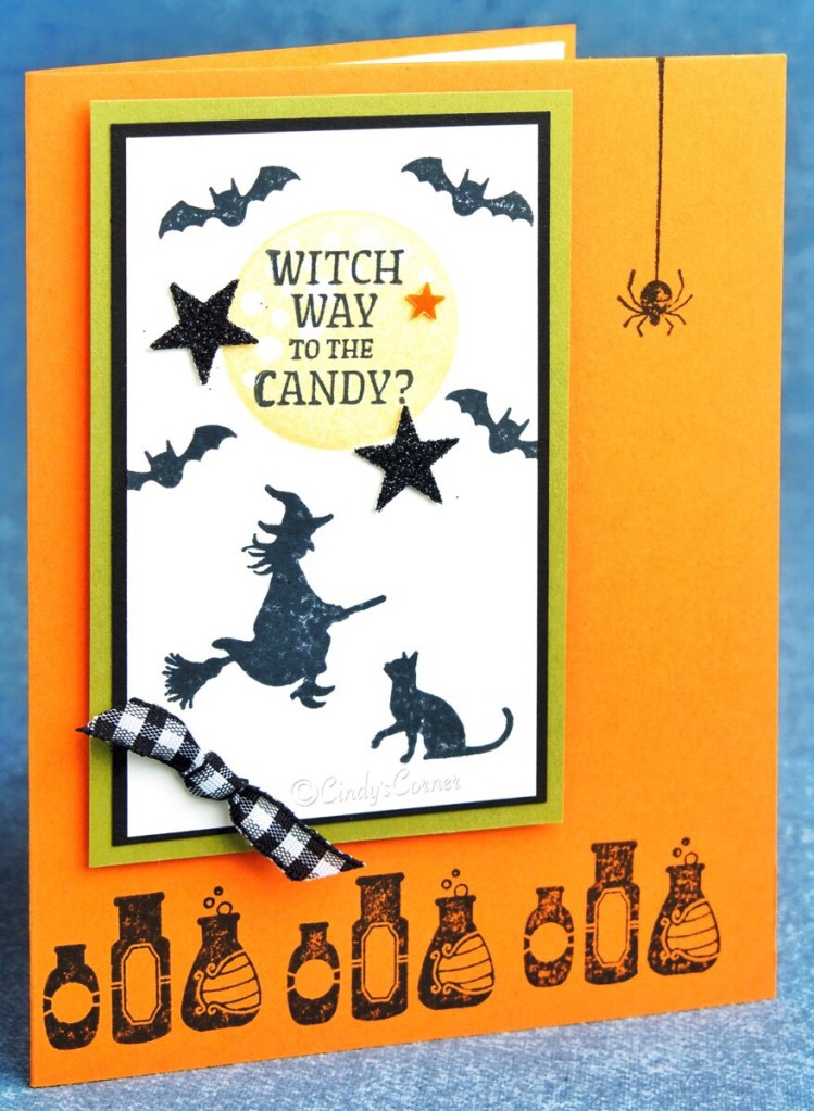 The little row of poison bottles is stamped three times along the bottom of the card base, with the spider dangling threatening above. A faux knot made from the Black and White Gingham Ribbon is attached with a Mini Glue Dot and a few Cute Stars Adhesive Backed Sequins added for a little bling and my card is done.