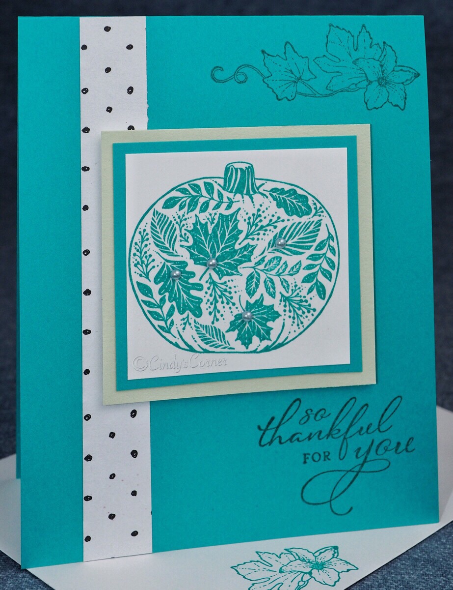 I seem to start a lot of my posts expressing my amazement on where we are in the year ~ next week will be Thanksgiving here in the US!! Today’s card uses the Pretty Pumpkin Stamp Set pairing Bermuda Bay with Soft Seafoam ~ some non-traditional colors which I think work very well together if you are looking to create something a little unusual.