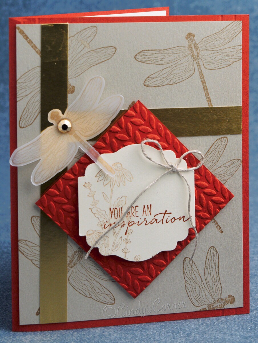 A little change of subject today – I think today’s card would be perfect for ladies or gentlemen in our lives who just need a little uplifting inspiration. Pairing Cajun Craze with a little gold foil and vellum with the Dragonfly Garden Stamp Set