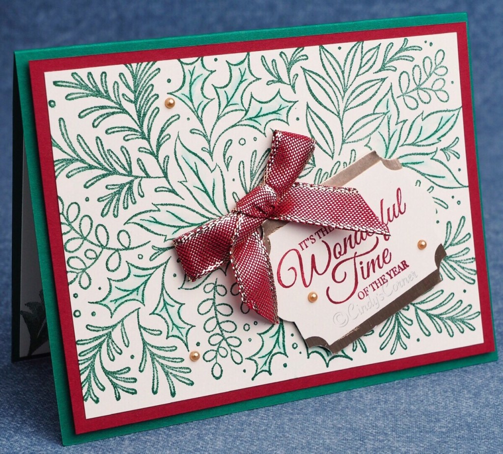 Today’s card uses the Festive Foliage Background Stamp with the Stamparatus, some nice traditional Christmas colors, a luxurious bow and a few gold Metallic Pearls.