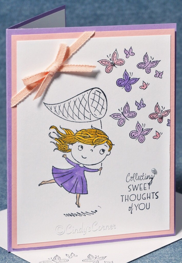 The Catching Butterflies Stamp Set is the free stamp set I am sharing. Using the Tuxedo Black ink to stamp all the images then using Stampin’ Blends to color them in. Highland Heather for her dress, Daffodil Delight for her hair, Fresh Freesia and Flirty Flamingo for the butterflies.