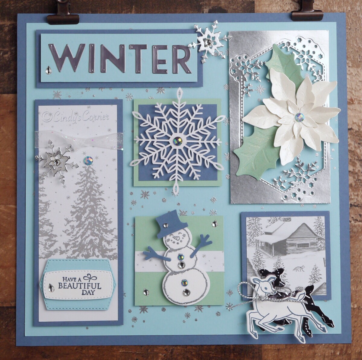 - Layer 1: 8 x 8 Balmy Blue Card ~ heat embossed with silver snowflakes