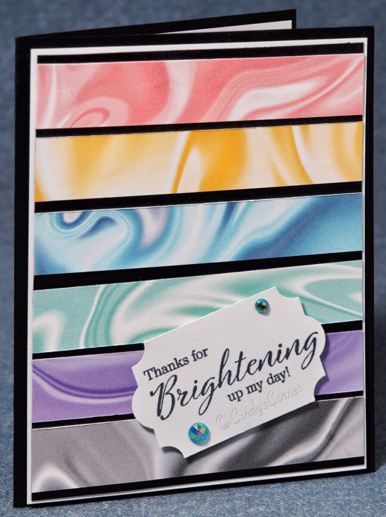 This is a very quick and easy card to make – I was inspired by an idea of Mary Knabe’s ~ it allowed me to showcase each of the colors contained in the pack of of decorative paper I was able to get for free! Layering onto black card really makes those colors pop!