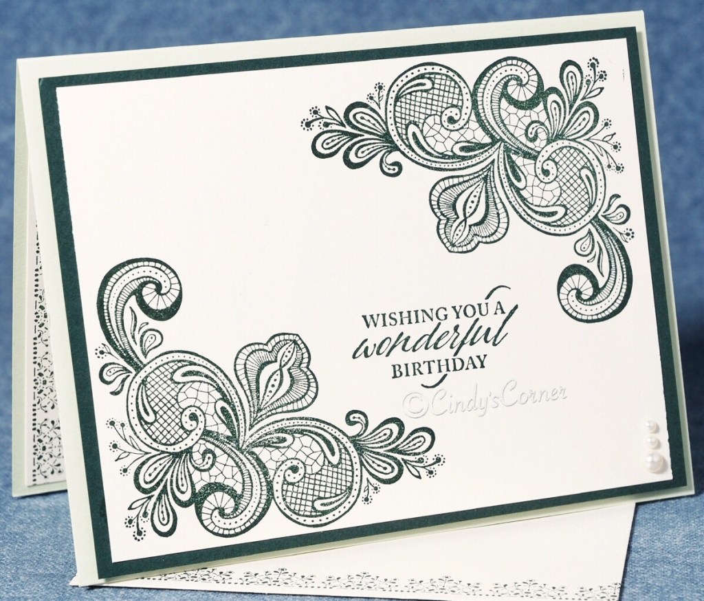 I simply stamped the large stamp in opposite corners and added the greeting to the center. Liquid Adhesive was used to attach the Very Vanilla layer to the Evening Evergreen layer then attached this to the card base with 4 – 5 Stampin Dimensionals. A trio of Pearl Basic Jewels in the corner to just add a bit more elegance!