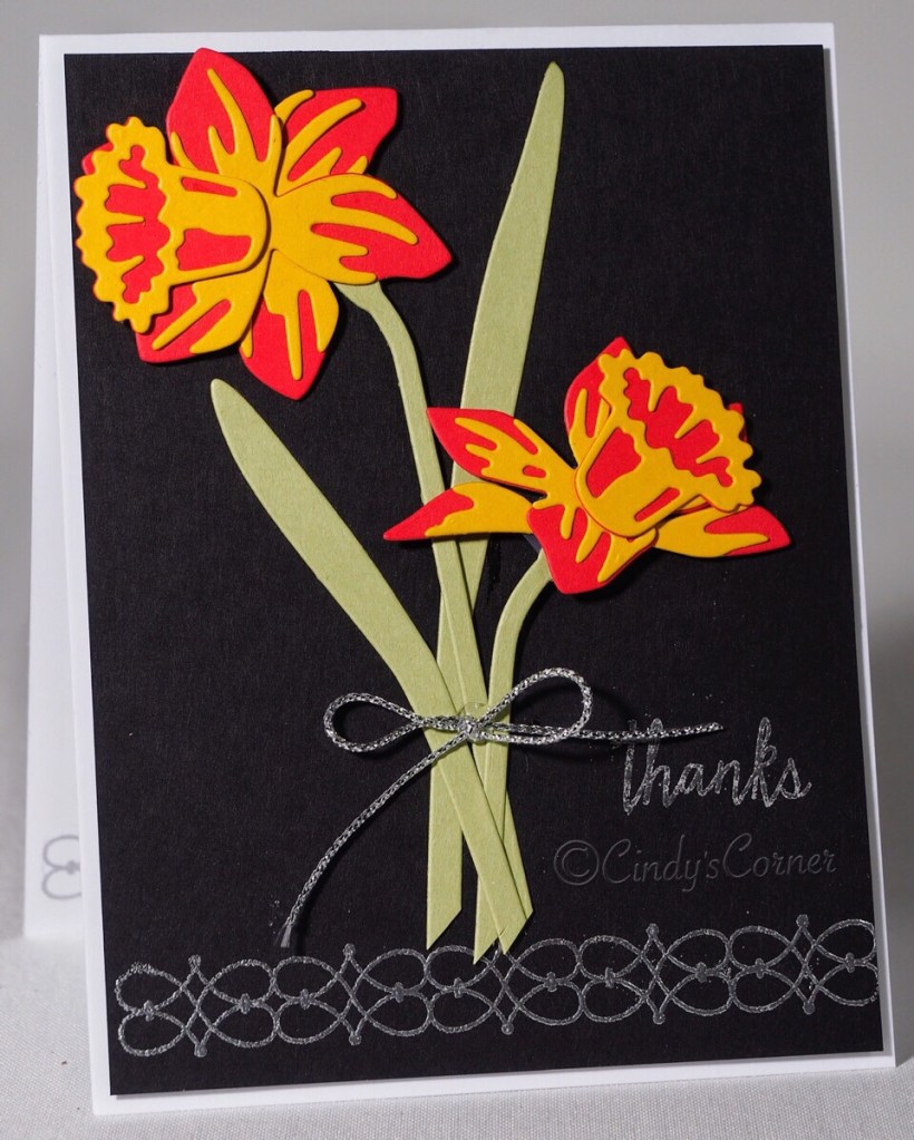 As you know – I hate waste – and seeing those two ‘wild’ looking daffodils sitting on my work bench troubled me! so I pulled out some Basic Black card, did a touch of heat embossing and attached them to create this thank you card.