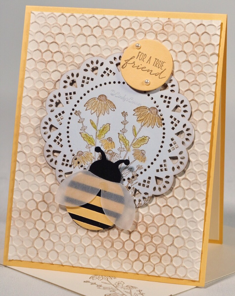 - Layer 1: 5 1/4 x 4 Very Vanilla Card ~ run thru the Cut and Emboss Machine with the Hive Embossing Folder