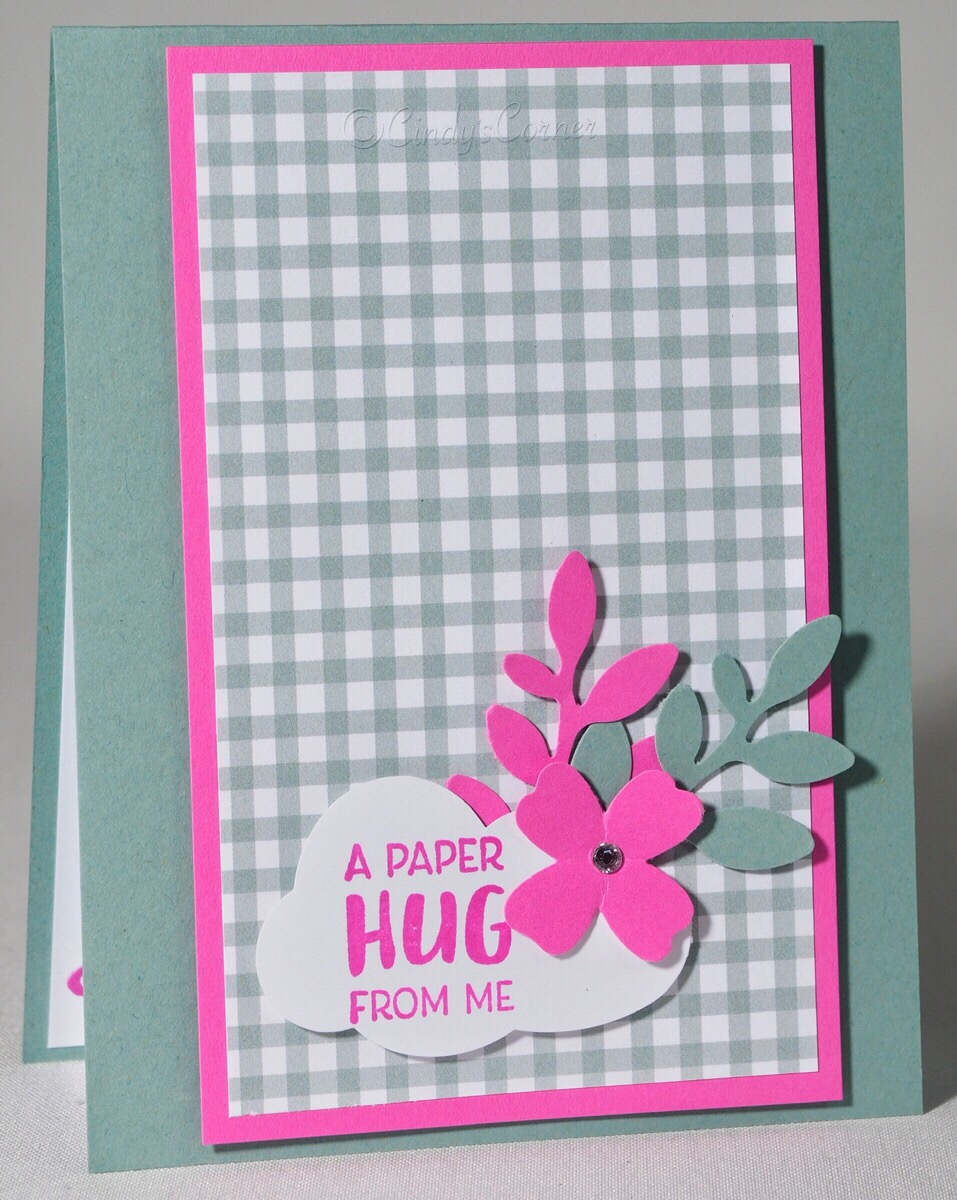 I chose some bright and vibrant colors for this one – if you need a hug then bright colors must be in order! The greeting is from the Limited Edition Stamp Set, after stamping cut with the Cloud Punch – unusual but adds a bit more fun! The embellishments are made with the Flowers and Leaves Punch and the Bough Punch.