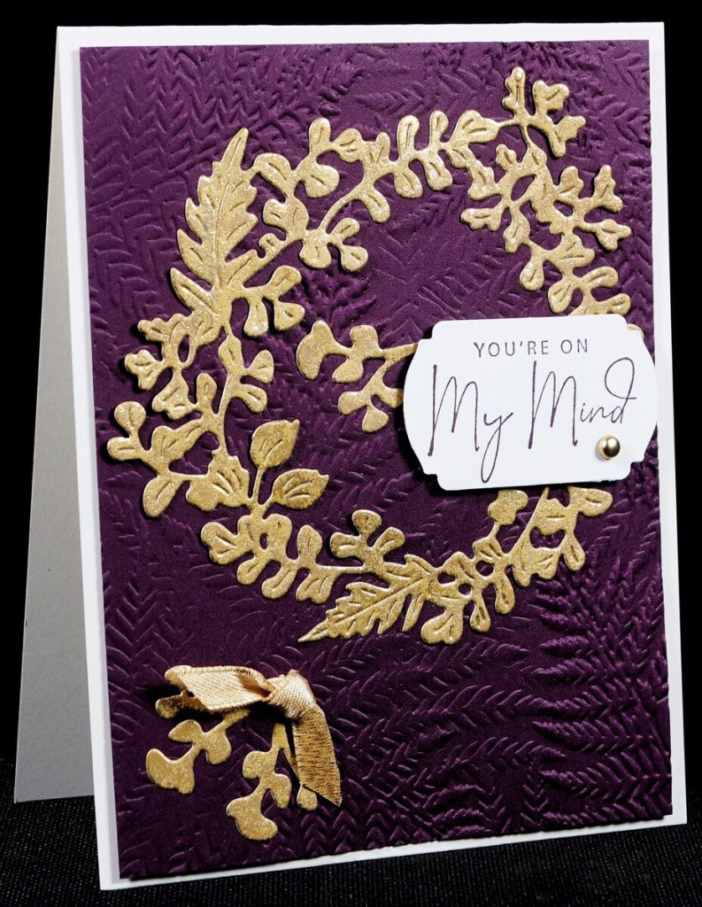 In an earlier post I introduced the Nature’s Prints Stamp Set with coordinating Natural Prints Dies. As I was sharing the dies I made a comment about the beautiful wreath die and how I would be making use of it in very short order. So today’s card does just that using one of the new specialty papers – Distressed Gold – which is absolutely stunning.