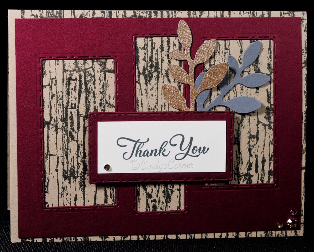 Today’s color combination was inspired by an RV (recreational vehicle) that pulled along side at some traffic lights, they looked so good together, Crumb Cake, Basic Grey and Merry Merlot, so it came together for this Thank You card.
