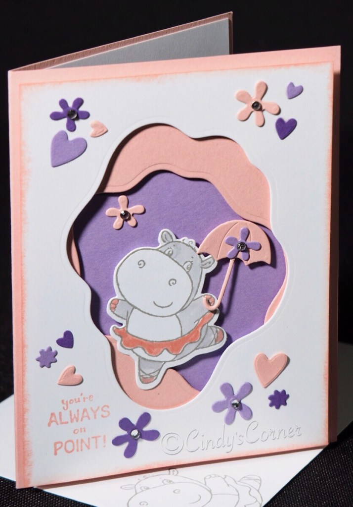 I used the Layering Diorama Dies to create the layers, attaching them together with a few Stampin Dimensionals to get a more 3D effect. My hippo is stamped in Smoky Slate ink then I used Blushing Bride Marker for her tutu and dance shoes. All the flowers, hearts and umbrella are all part of the Hippo Dies, I used my scraps to cut out a whole bunch of them then attached with Mini Glue Dots.