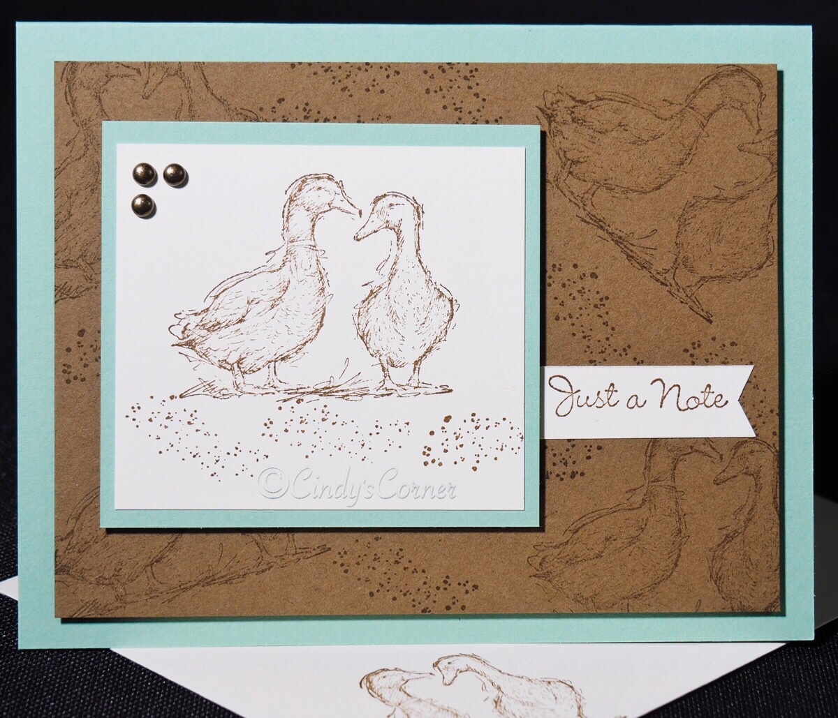 This is a very quick and easy project – using card, ink and stamps. I started with stamping ‘tone-on-tone’ the ducks and the little ‘dotty’ stamp and Soft Suede ink, then attached it to the card base with Stampin Dimensionals. As Stylish Sketches doesn’t have any greetings I used my current ‘bestest’ favorite Go To Greetings Stamp Set. Stamped onto a scrap of Very Vanilla and trimmed into a banner with my Paper Snips. A trio of Rustic Metallic Dots to finish off. If you used one of the other greetings in the stamp set I think it would make a great masculine birthday card.