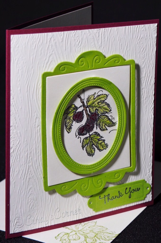 I really put the Fabulous Frames Dies to work with this card – after stamping, heat embossing and coloring the figs with Stampin Blends I cut it with the 2nd largest frame, just using the central piece. I then cut a second frame in Granny Apple Green card to lay the figs before layering the oval frame over the figs.
