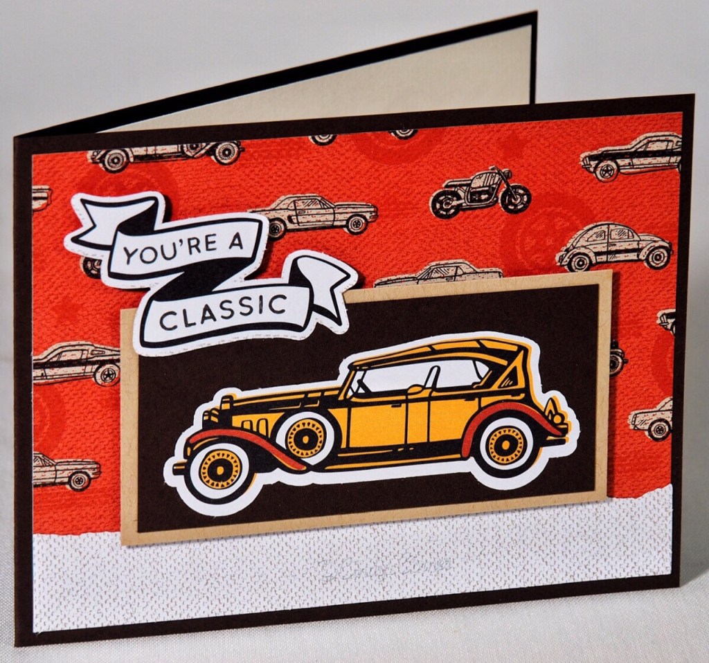 The light banner at the base of the paper is one of the die cut pieces, simply attached with some Liquid Adhesive. The Crumb Cake and Early Expresso layers are attached tot he card base with a few Stampin Dimensionals, then die cut car and greeting added, to complete the design. This was a very quick card to make with the minimum of supplies. The paper pack also has a camping, BBQ, and for those who are ‘dapper dressers’ themes.
