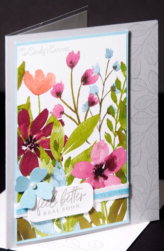 Today I bring you a card where decorative paper takes center stage, some ‘tone-on-tone’ stamping and a little ribbon! I have used the Cottage Rose Stamp set to make this into a ‘Get Well’ card, although I think the layout and colors would work equally as well for a birthday, thank you or a ‘just because’ kind of card.