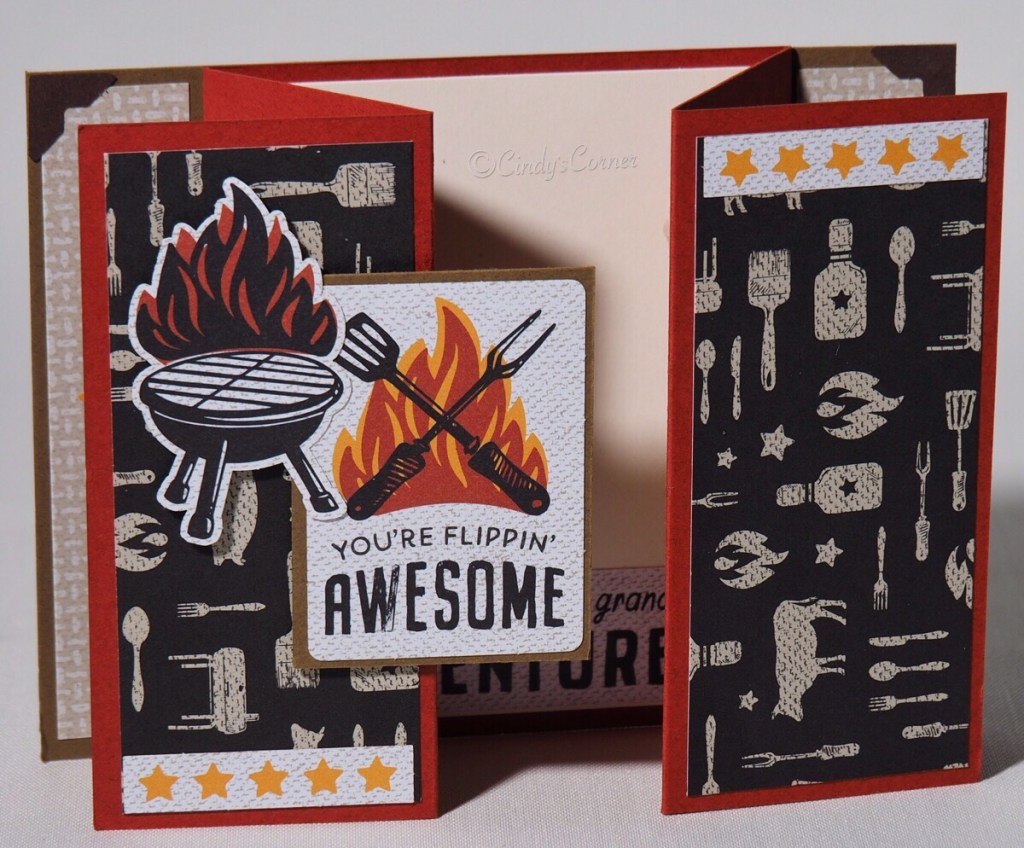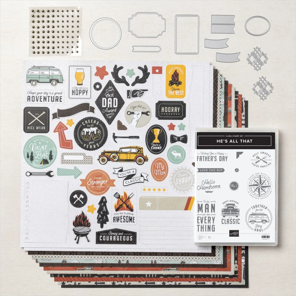 I struggle with making card for the fellas in my life – do you have the same problem? In the current annual catalog is a suite of products that can help solve this – the He’s The Man Suite is all about ‘guy type’ things, images, colors and interests – from Bar B Que’ing to Camping to Cars. So today I am focusing on that suite with help from Stampin’ UP! and a couple of my own creations!