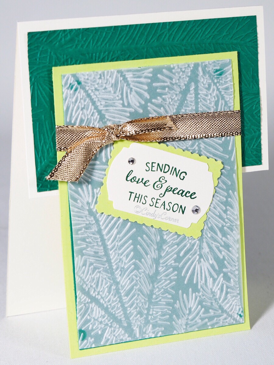 - Layer 1: 4 x 2 1/2 Shaded Spruce Card ~ run thru the Cut and Emboss Machine with the Wintry Embossing Folder