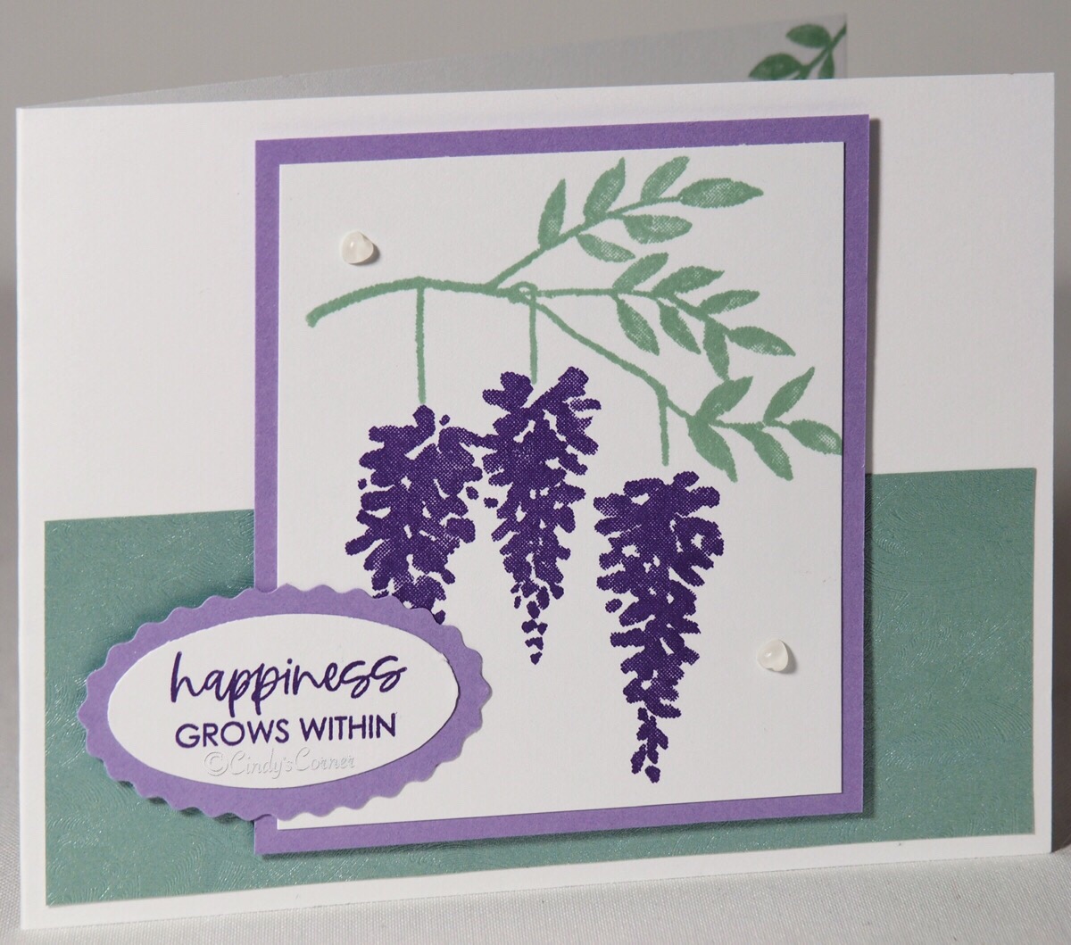 The Wisteria Wishes Stamp Set has very pretty floral images as well as greetings stamps in a cursive font – my favorite kind of set 🙂 Today’s card is very easy to create and showcases the lovely Brushstrokes Specialty Paper.