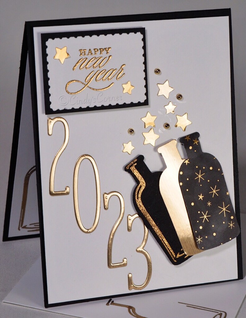 I cut my bottle out of the Gold Foil with the Vintage Bottle Punch, then heat embossed some Basic Black scraps with the coordinating Bottled Happiness Stamp Set and Gold Embossing Powder. The stars are cut using the Witch Hat Builder Punch (which is now retired 😦 ) and I added a few gold Festive Pearls for my ‘champagne bubbles’