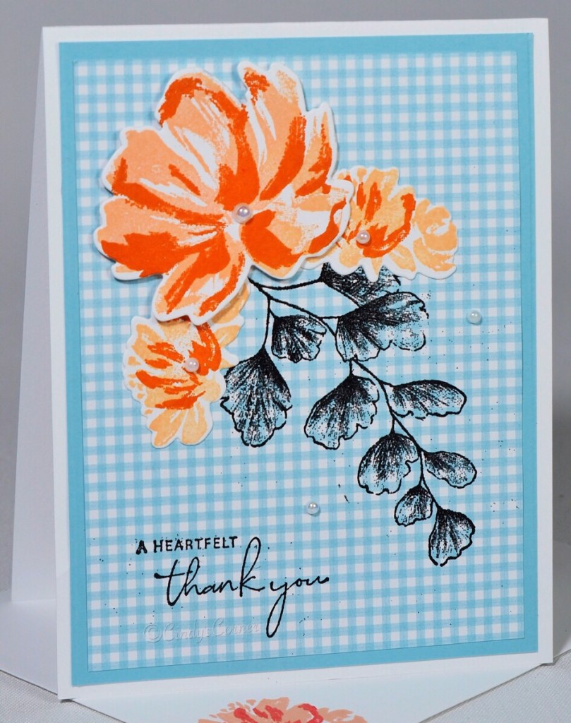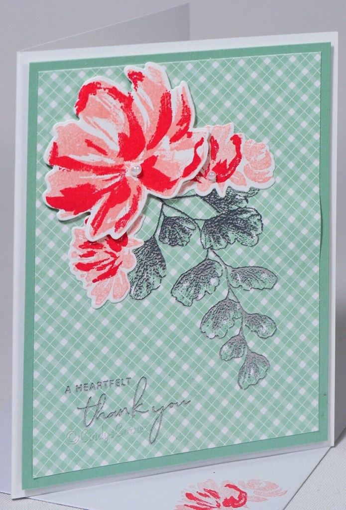 As I explain in the video the heat embossed leaves and greeting are done first then the flowers stamped, cut with the coordinating Nature’s Prints Dies before attaching with Stampin Dimensionals.