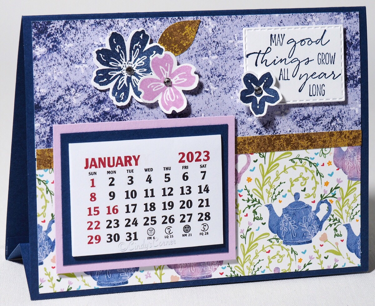 Today I have a cute desk top calendar to share – and it will fit in a regular envelope for posting!!! I have used a mixture of products from the new 2023 Jan – April Mini Catalog and the Annual Catalog. I think sometimes I get so caught up in the new goodies that I can overlook the ones already in my stash. So Tea Boutique decorative paper and Dragonfly Garden Stamp Set are from the Annual Catalog and the Petal Park Bundle is from the new mini!