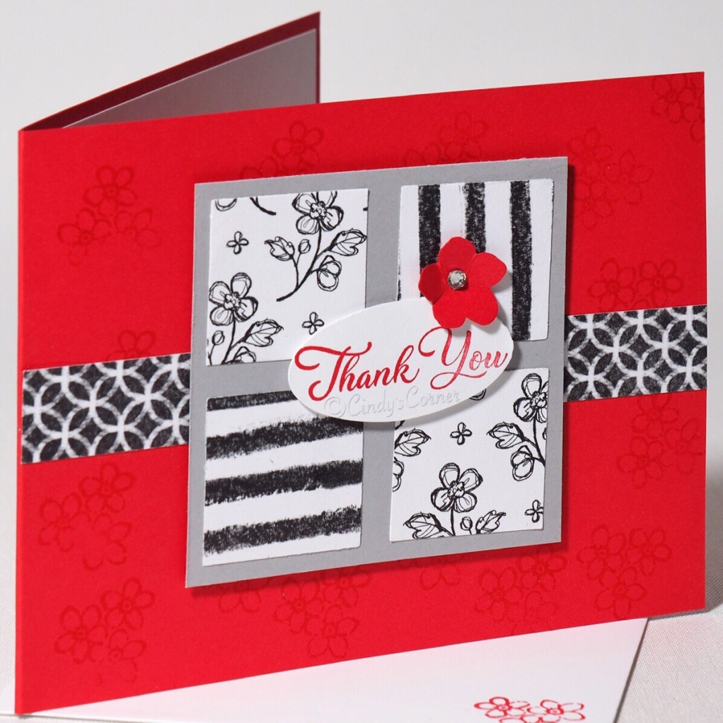 With the aid of a couple of punches, I am letting the decorative paper do all the work for my card today. The black and white of the Perfectly Penned decorative paper pack is just perfect to go with any color, so I chose to go with the vibrant Poppy Parade with a little Smoky Slate as a background.