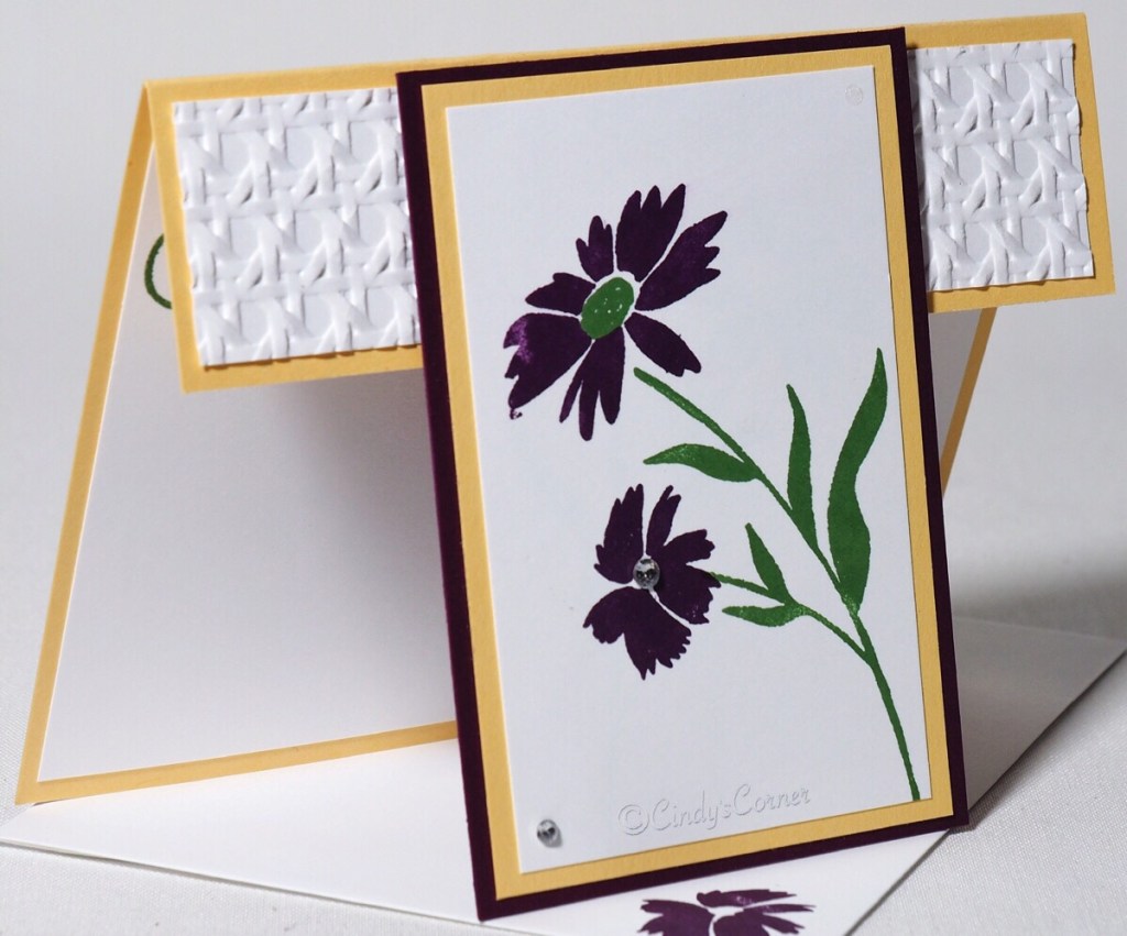 My color combination for today’s card was inspired by a flower arrangement in the hotel lobby where we stayed for a wedding in Calistoga CA last spring! I saw it and immediately thought So Saffron, Garden Green and some deep Blackberry Bliss roses. I jotted it down in my notebook and finally got around to using it with the Sending Smiles stamp set.