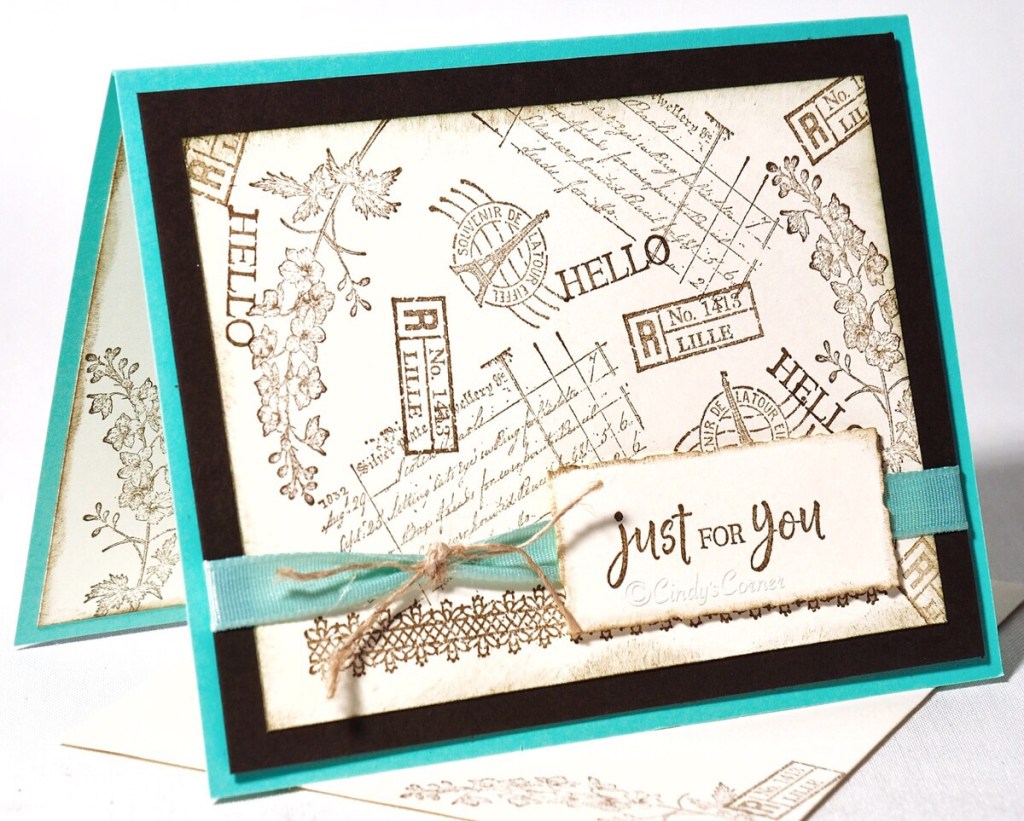 I randomly stamped the various images on the Very Vanilla Card layer before sponging the edges with Small Blending Brushes. I wrapped some of the new Pool Party Striped Grosgrain Ribbon around the front panel attaching it to the back with some adhesive tape then cinched it on the front with a double length of Linen Thread. My greeting is from the same stamp set and cut with the Deckled Edge Rectangle Dies which just adds to the vintage look of the card. I just love the finished effect.