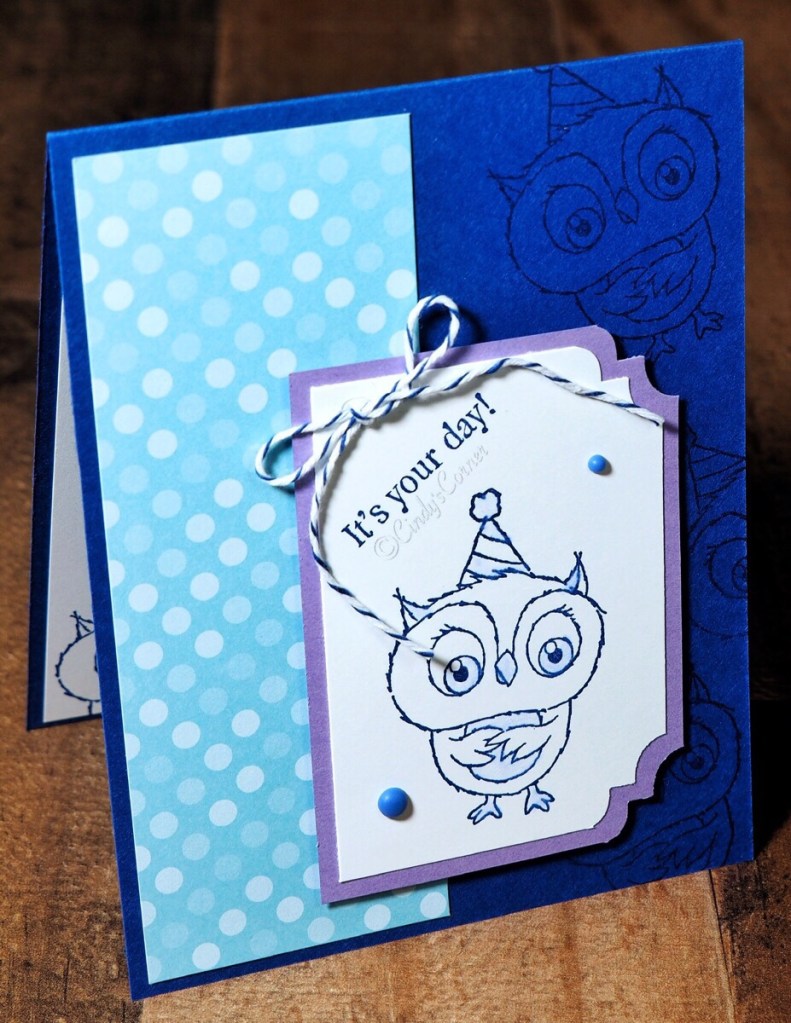 I used the little owl to tone-on-tone stamp onto the base card before adding the strip of decorative paper. The main panel with the owl is also stamped in Starry Sky ink, I then used a Blender Pen to ‘smooch’ the color onto his chest, feet, eyes, beak and hat, this just gives it a little more depth.