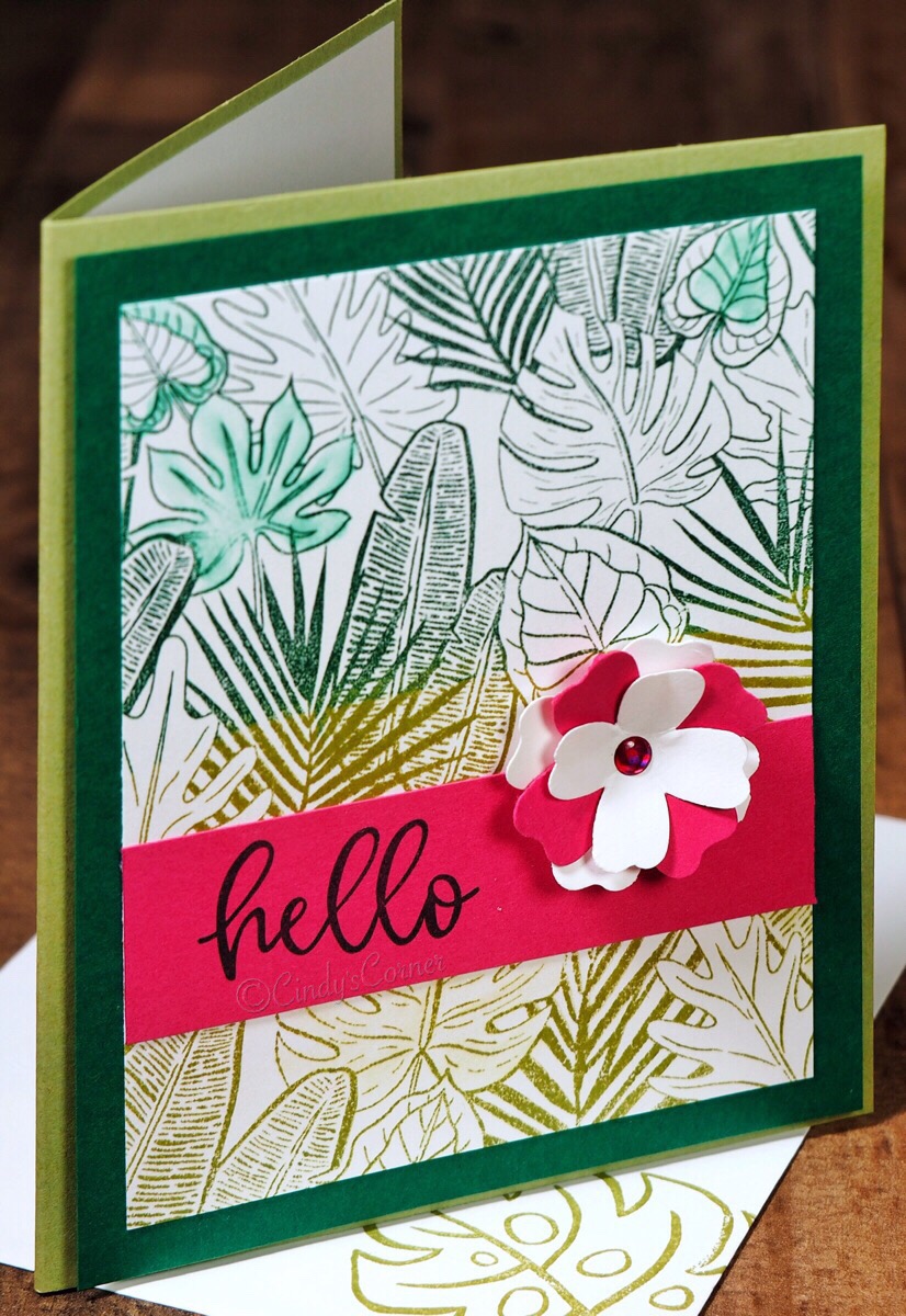 ‘Hello‘ is such a happy word, it is the start of something new – a conversation, new friend or a new discovery. My card today will work for just any occasion ~ even to send ‘ just because’! I have chosen some bright ‘tropical’ colors to compliment the Tropical Hideaway Background Stamp and added a cute flower to finish it off.