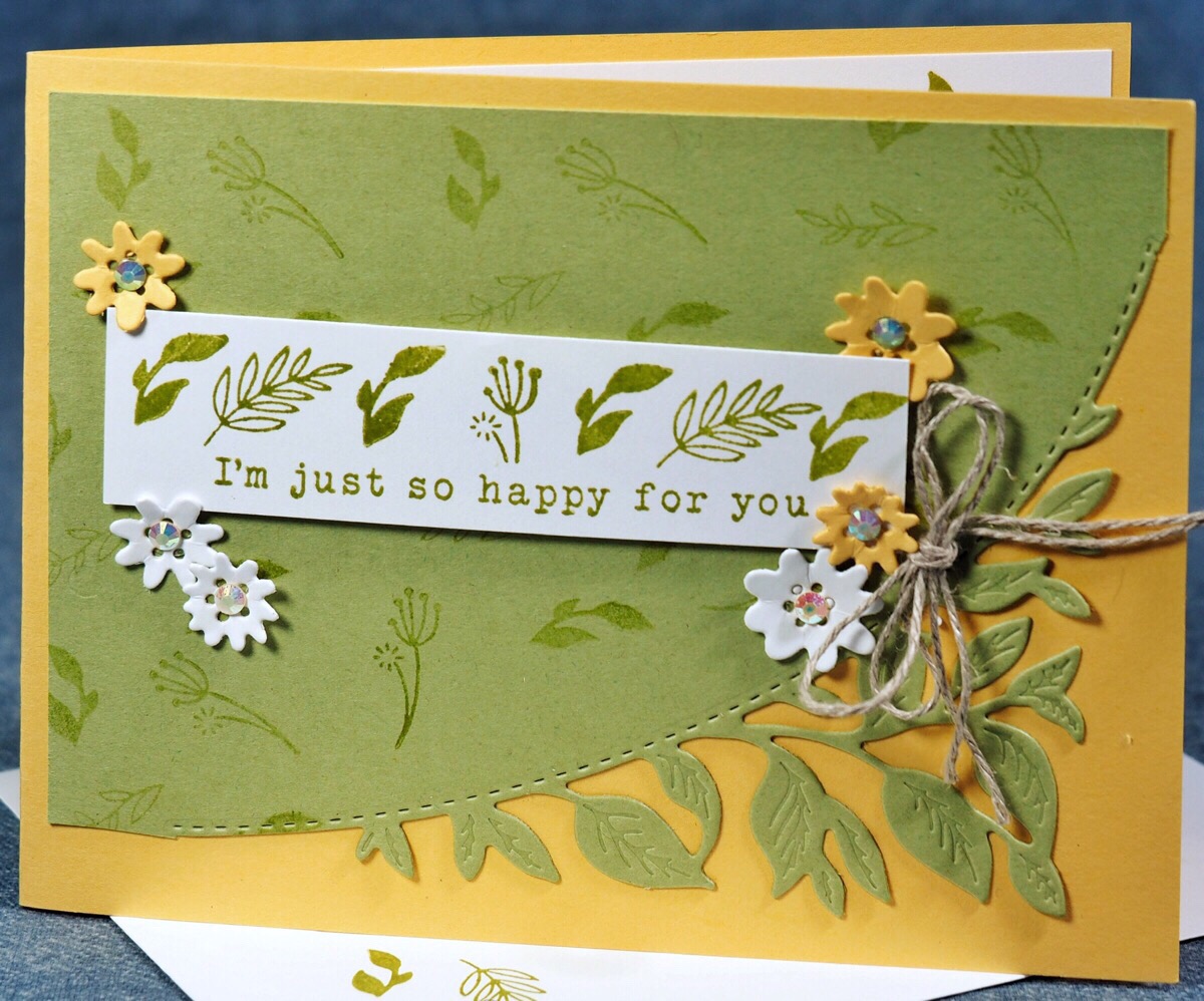 Once cut I stamped the Pear Pizzazz layer with the little floral stamps using the same color ink – this is called tone-on-tone stamping, then attached it to the card base with some Multipurpose Liquid Adhesive. The greeting banner is attached with Stampin Dimensionals and the little blossoms with Mini Glue Dots.