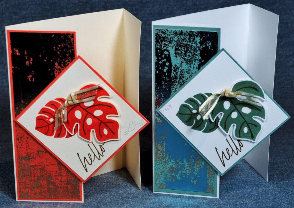 So I am a little behind with posting these cards as some of the papers retired at the beginning of this month, however the gatefold fancy fold is great fun and you can choose any of the decorative papers in your stash, pick out one or two colors and recreate this card, I just love that Tropical Leaf Stamp Set!………. oh and did I mention there is a video to go along with it?
