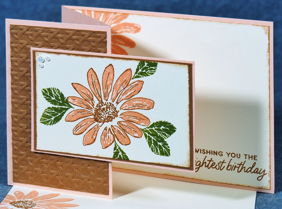 I chose my favorite Lazy Z fun fold to showcase the card colors as well as the images. I used a 2-step stamping technique ~ starting with stamping the outline in Pecan Pie ink then adding the ‘filler’ with Petal Pink ink, finally adding the leaves in Old Olive. I sponged the edges of the very vanilla layers with a little Pecan Pie and a Sponge Dauber. I added a trio of Iridescent Pearls Basic Jewels for a little added sparkle.