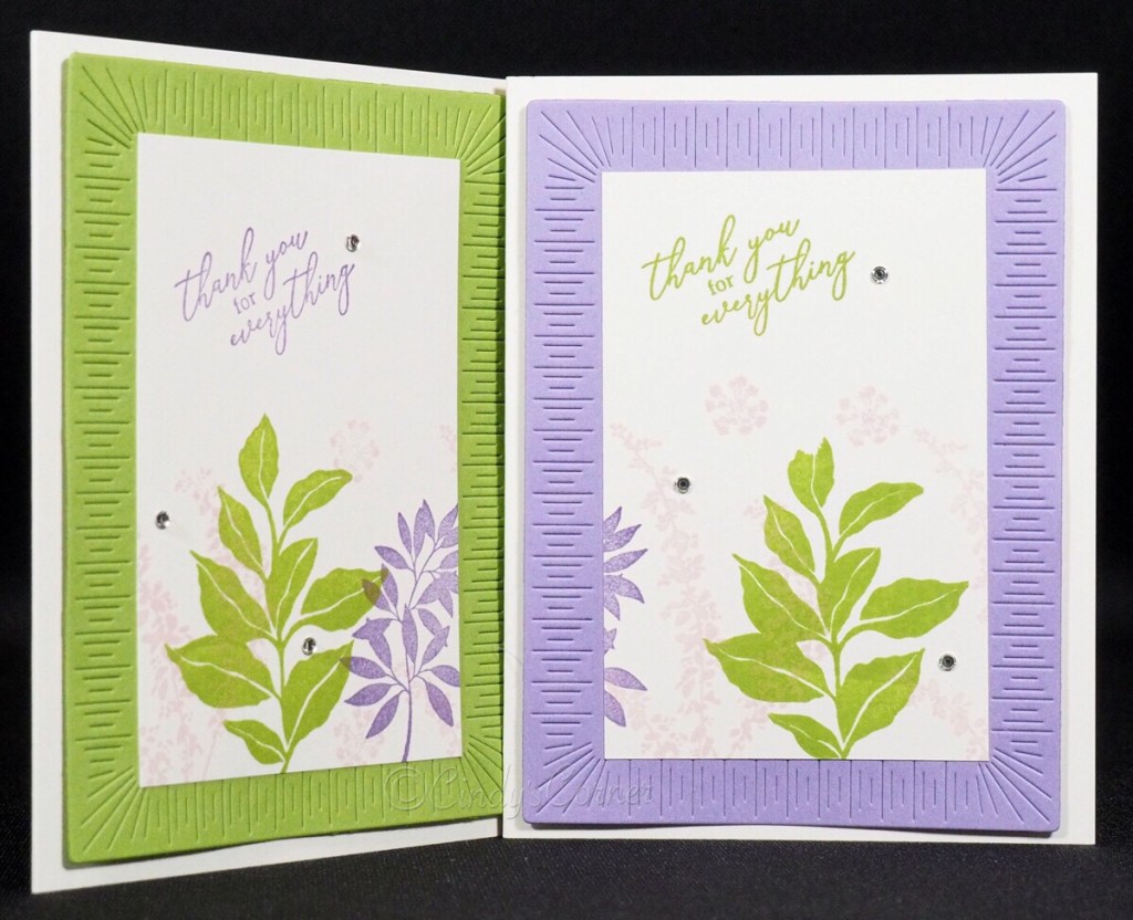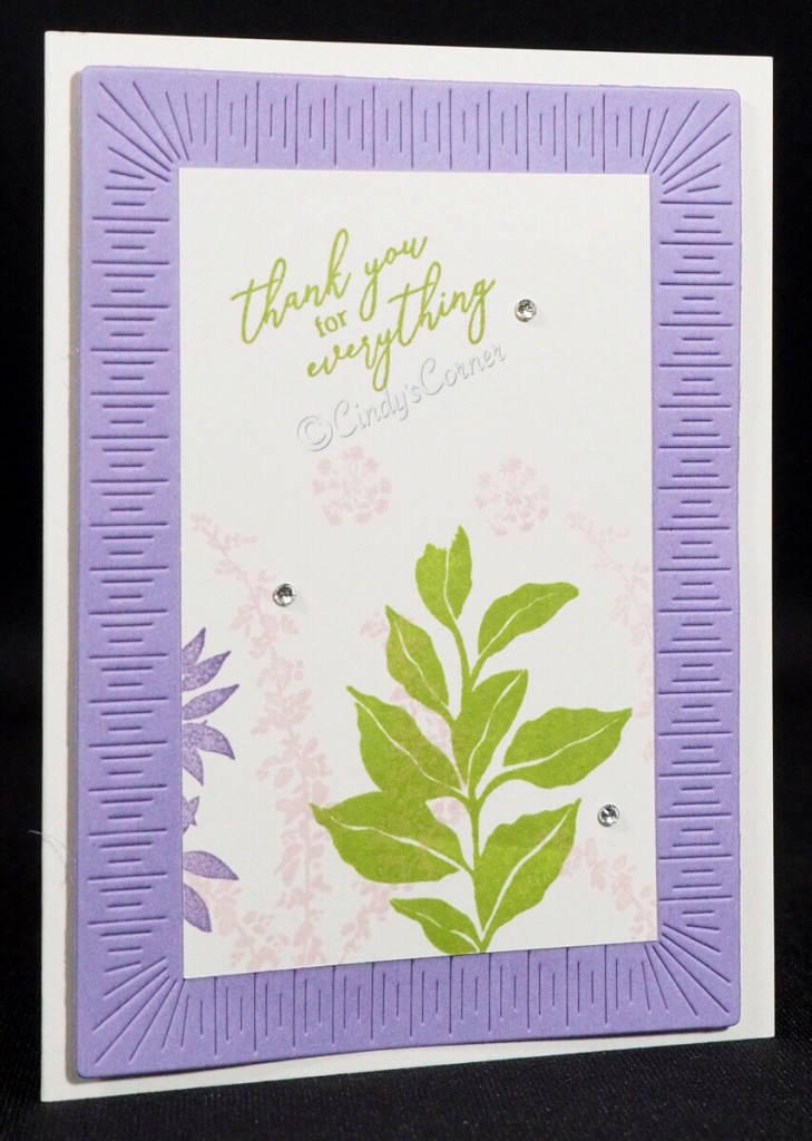- Layer 1: 5 1/2 x 4 1/4 Granny Apple Green or Highland Heather Card ~ run thru the Cut and Emboss Machine with the