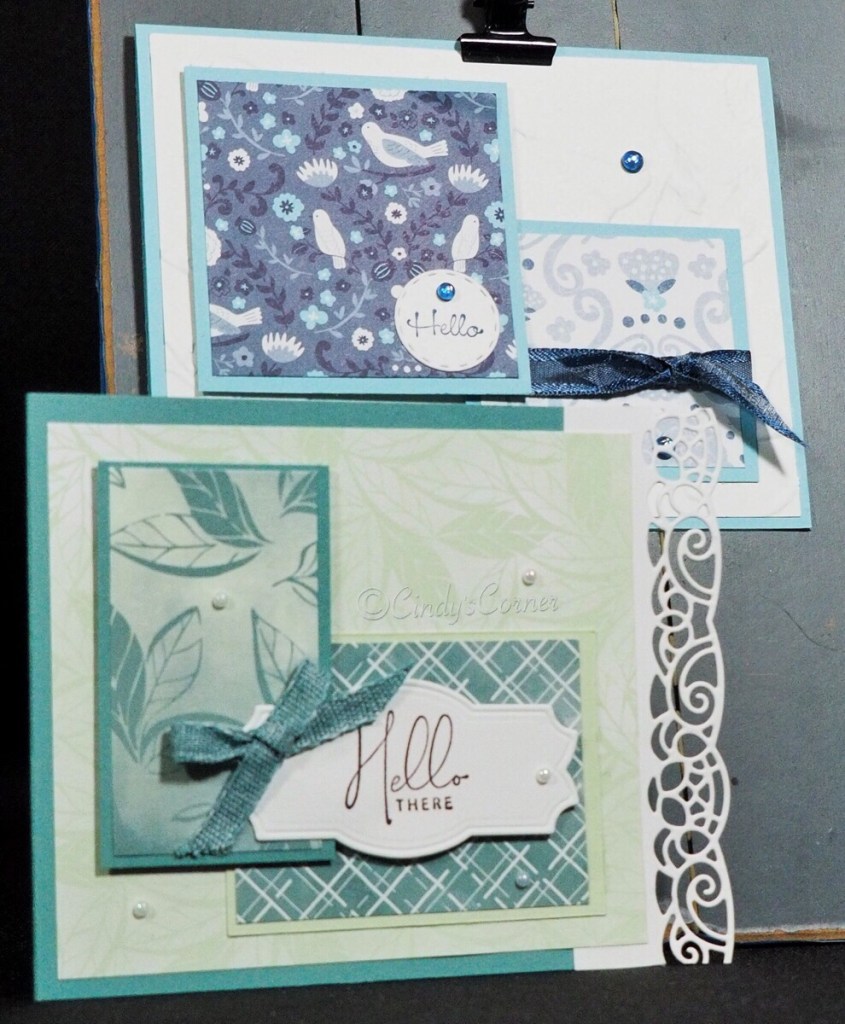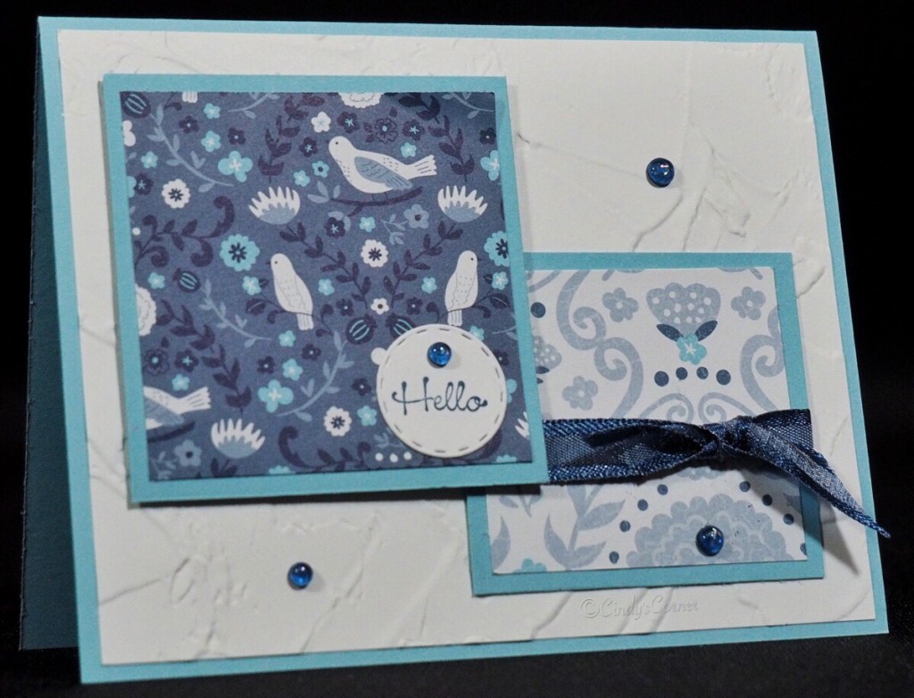 - Layer 3: 2 1/2 x 2 1/2 Country Side Inn Decorative Paper layered onto 2 3/4 x 2 3/4 Balmy Blue Card