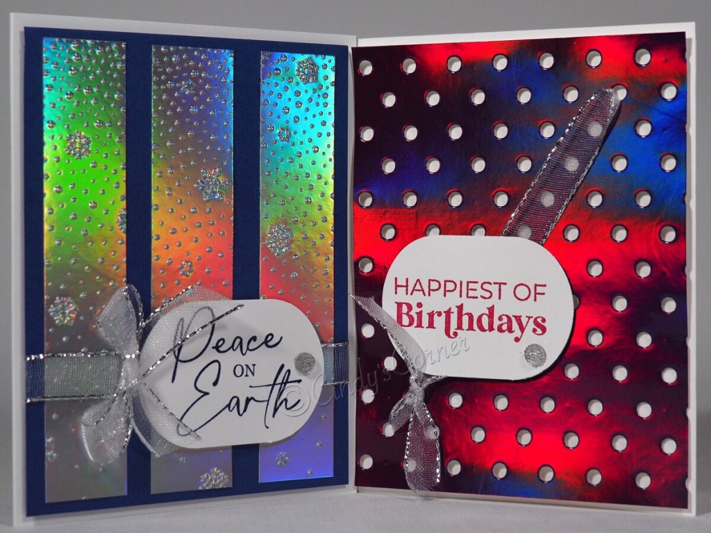 - Layer 1: 5 1/4 x 4 Holographic Specialty Paper ~ run thru the Cut & Emboss Machine with the Dots and Spots Die