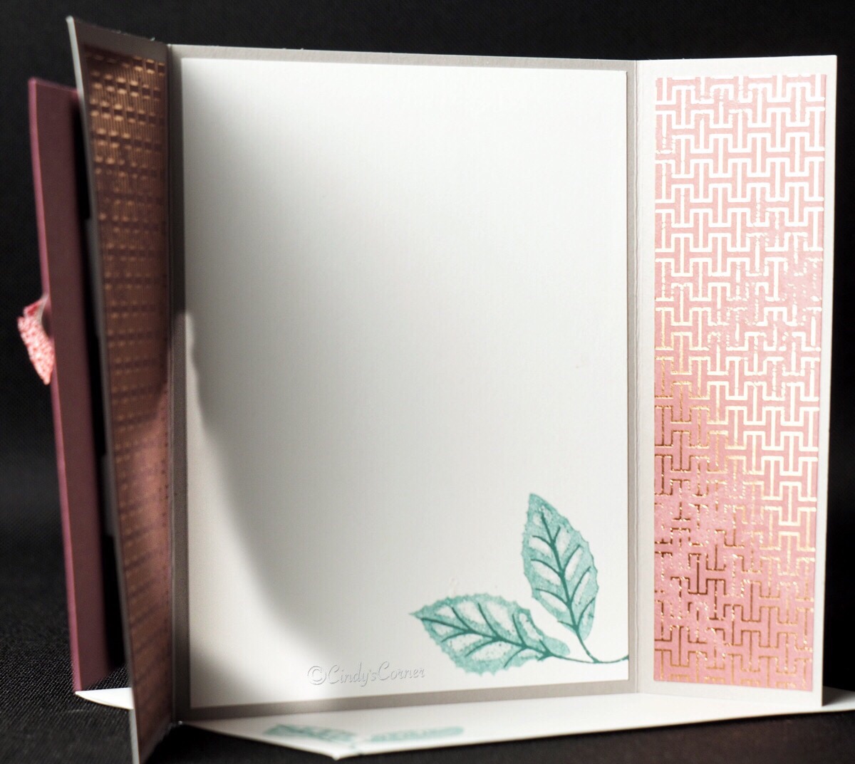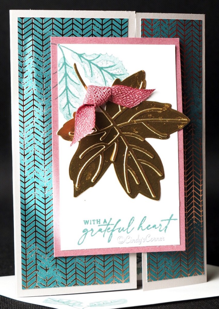 I chose to use the Autumn Leaves Stamp Set with coordinating Autumn Leaves Dies along with some Gold Foil for my center leaf topped off with a little knot of Moody Mauve Textured Ribbon to decorate this offset gatefold card.