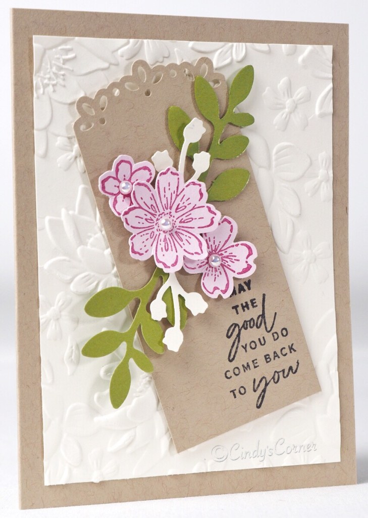 The top of the decorative tag is cut using the Elegant Edge Tag Topper Punch and attached to the card with Stampin Dimensionals. The flowers are from the Petal Park Stamp Set, stamped on Bubble Bath card with Berry Burst Ink and cut with the coordinating Petal Park Punch. The leaves are cut from scraps of Old Olive and Very Vanilla Card with the Bough Punch. All these pieces are attached with Mini Glue Dots and some Iridescent Pearls added for some subtle bling.
