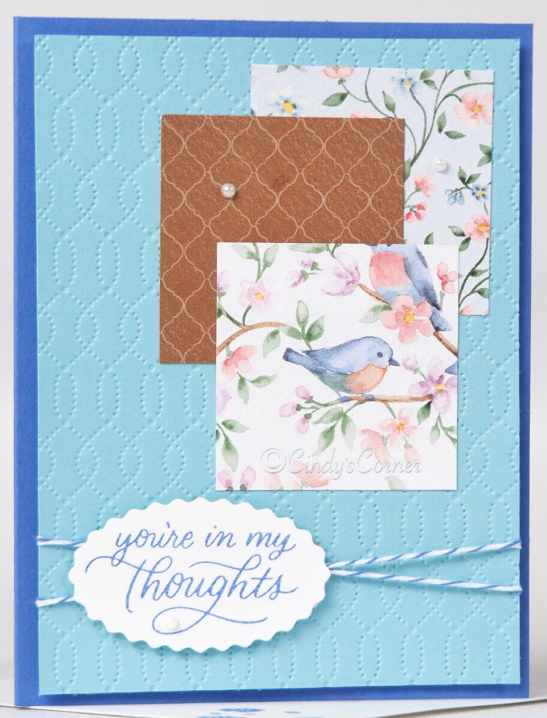 - Layer 1: 5 1/4 x 4 Balmy Blue Card ~ run the the Cut & Emboss Machine with the Softly Sophisticated Embossing Folder (SAB Freebie)