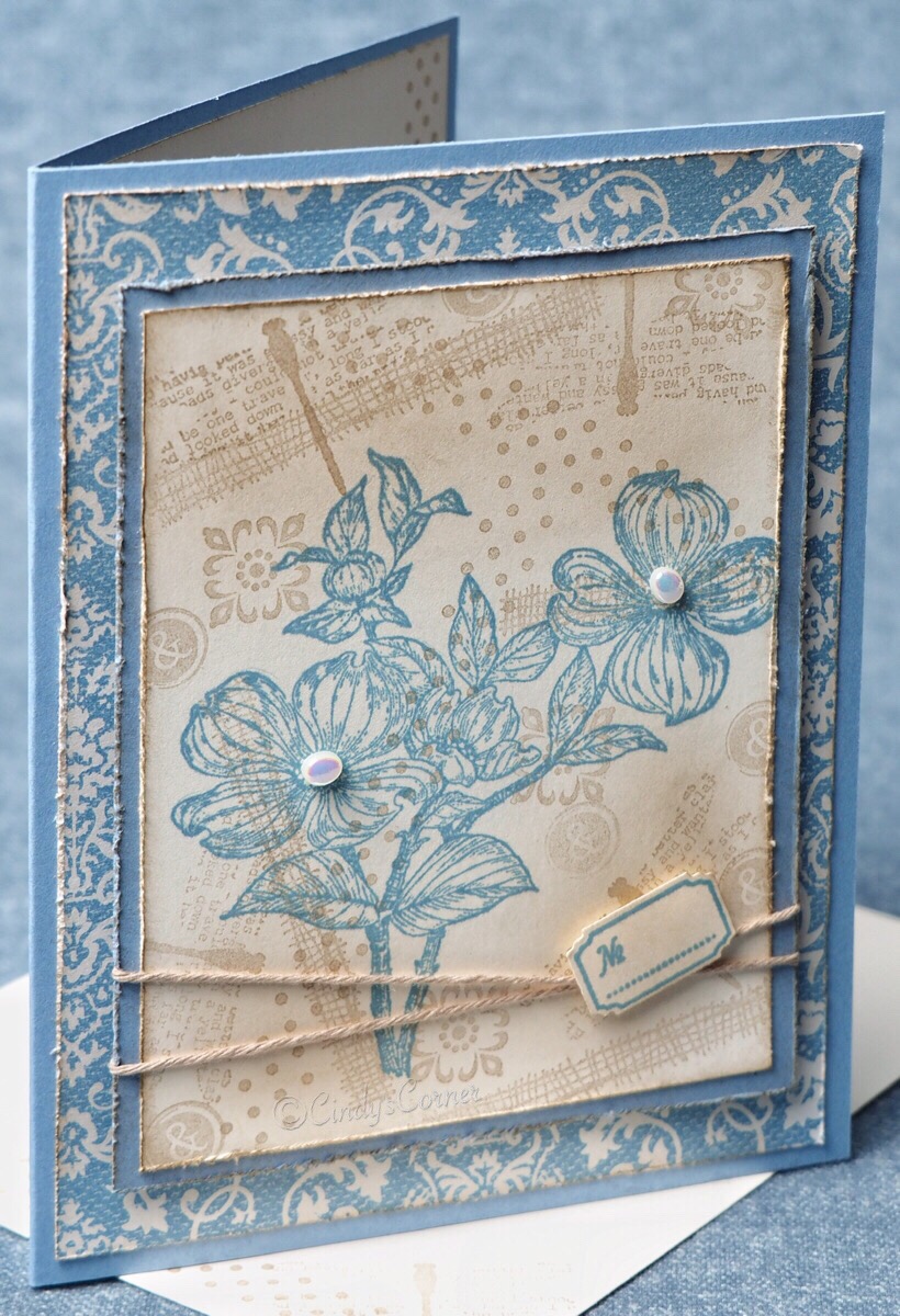 I do love the vintage technique (shabby chic) for my cards – it takes a little time but is satisfying to do and the final finish is so worth the effort. When I saw the Sale-a-bration exclusive free stamp set, Detailed Dogwood, I just knew it would be perfect for this technique, especially as it has a fine collection of eclectic images along with a beautiful dogwood spray. It also gave me a chance to use a few techniques as well.
