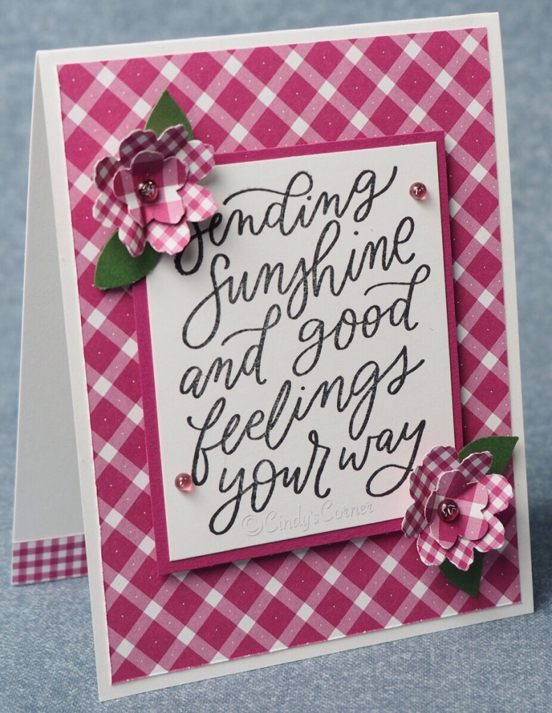 The Good Feelings Stamp set has 6 lovely big greeting stamps that are just perfect for the focus of my card. I chose to use the Berry Burst paper for my background then cut out some flowers from the scraps with the Petal Park Builder Punch and added a couple of leaves cut from a scrap of Garden Green card. Each flower has a Berry Burst embellishment from the Tinsel Gems Four Pack and where added to the card with a couple of Mini Dimensionals.