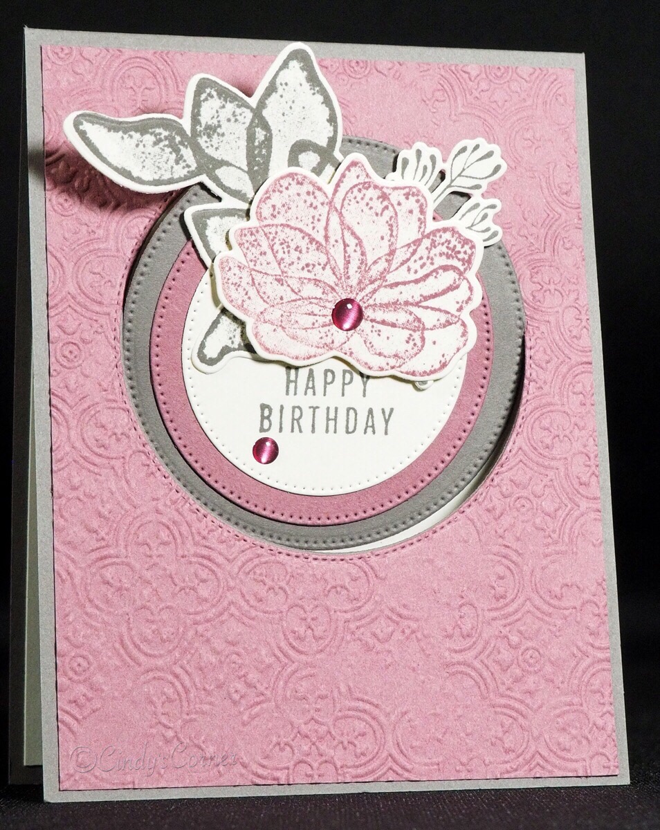 - Layer 1: 5 1/4 x 4 Moody Mauve Card ~ run thru the Cut & Emboss Machine with the Distressed Tiled Embossing Folder