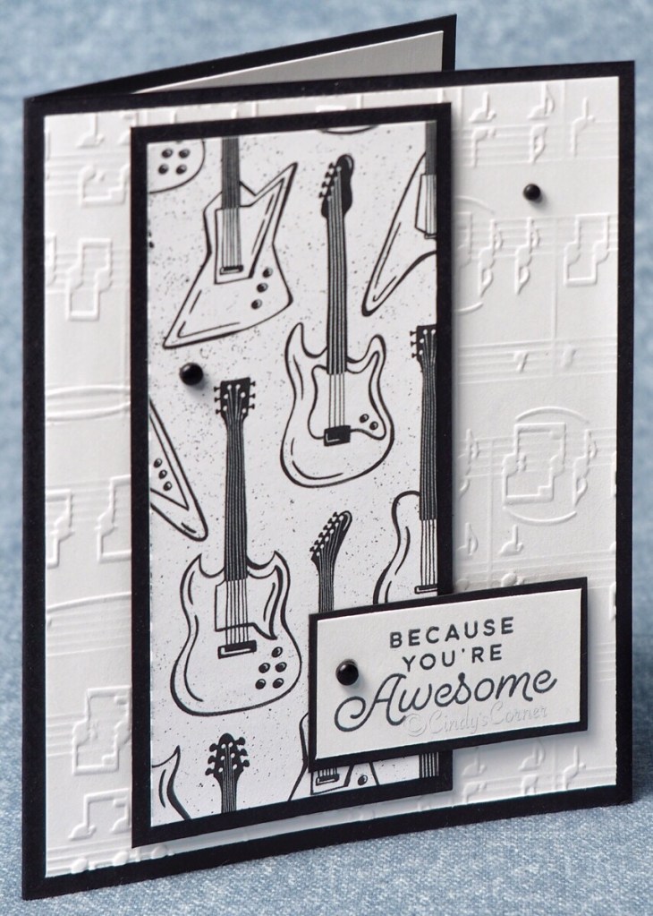 I have let the decorative paper do all the work and the simplicity of the layers makes it a very quick and easy card to do. All layers are attached with Multipurpose Liquid Adhesive, I just popped up the ‘guitar’ layer with Stampin Dimensionals before scattering some black Classic Matte Dots.