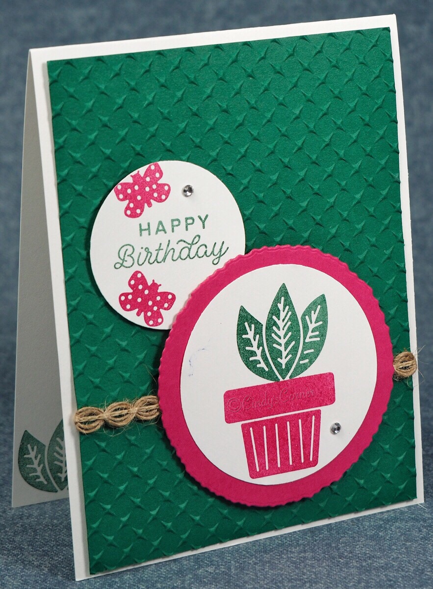 I started by stamping the flower pot on a 2 3/8 Circle of Basic White Card, then used a sticky note to mask off the top of the pot before adding the leaves. This is then attached to the Melon Mambo circle with a little Multipurpose Adhesive then used Stampin Dimensionals to attach to the card base. The 2″ circle with the greeting is also attached with Dimensionals before a scattering of Rhinestone Jewels is added.