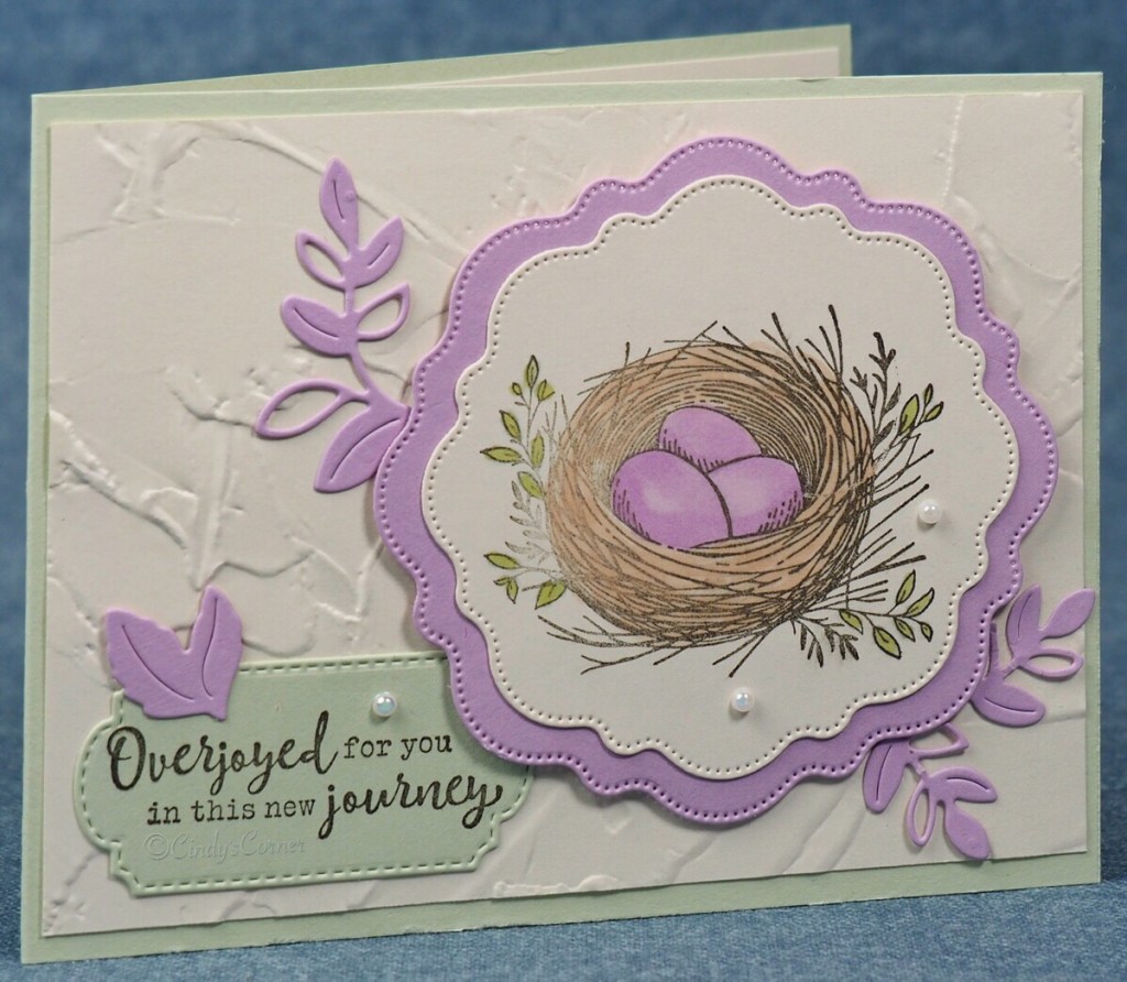 Those pretty panels are cut using the Thoughtful Expressions Dies then using Early Expresso ink to stamp the nest as well as the greeting, I then used Highland Heather Stampin Blends for the eggs, Pecan Pie for the nest and Old Olive for the leaves. A few Iridescent Pearls randomly scattered finishes everything off.