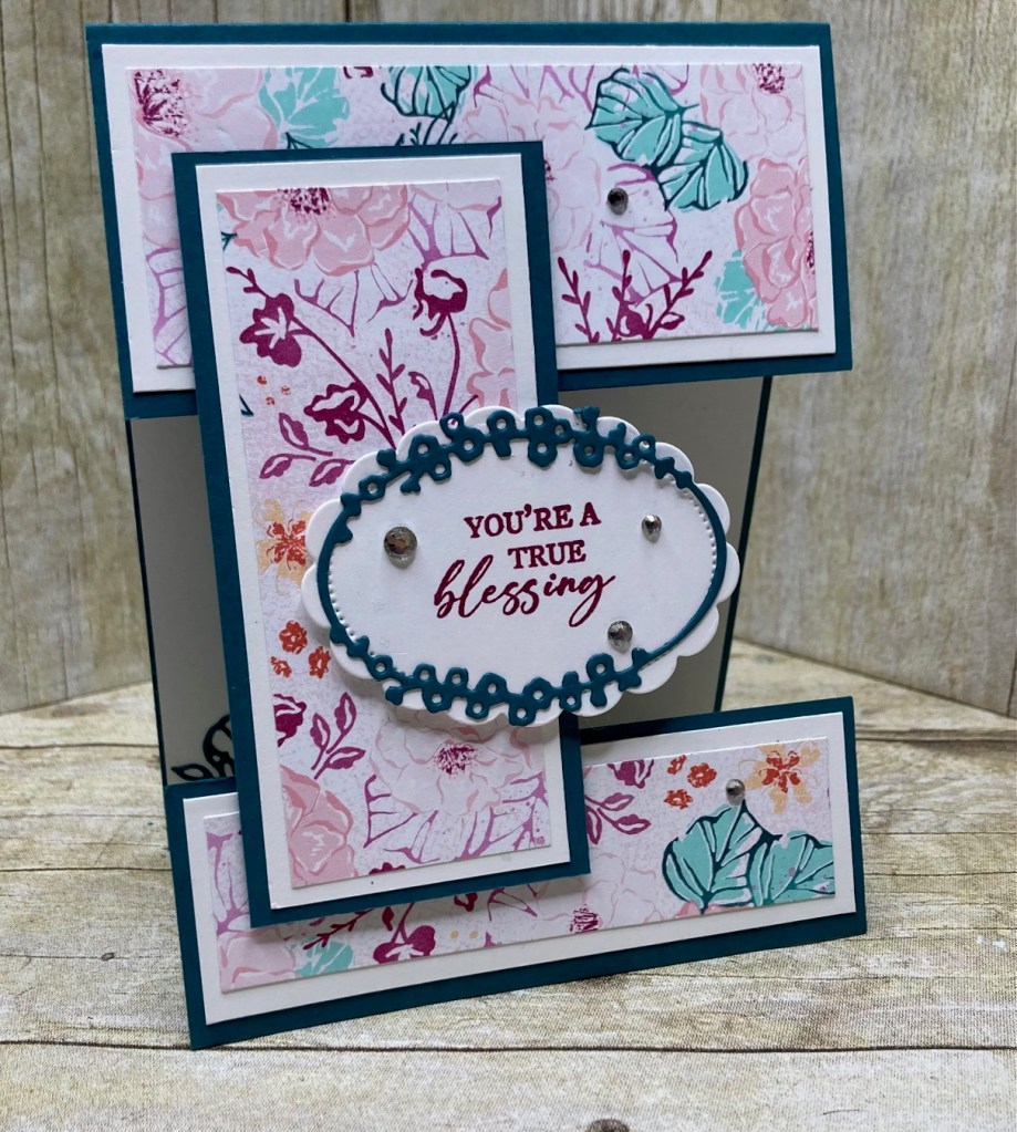 Trim 1 1/2 ” from bottom of one side of the Base card then a further 2″ to create the split. My greeting is from the Unbounded Love Stamp Set with coordinating dies and a gentle scattering of Basic Rhinestone Jewels.